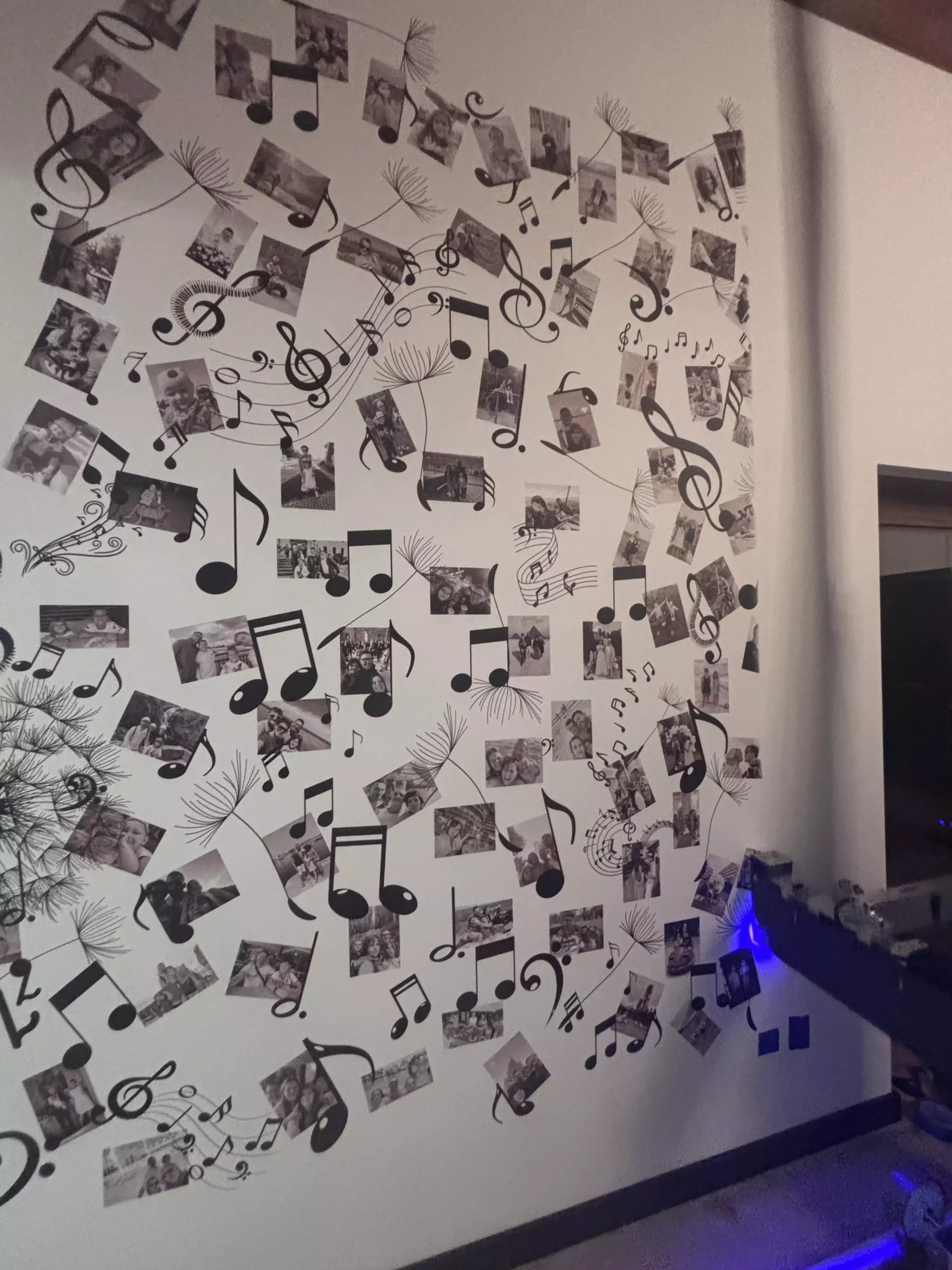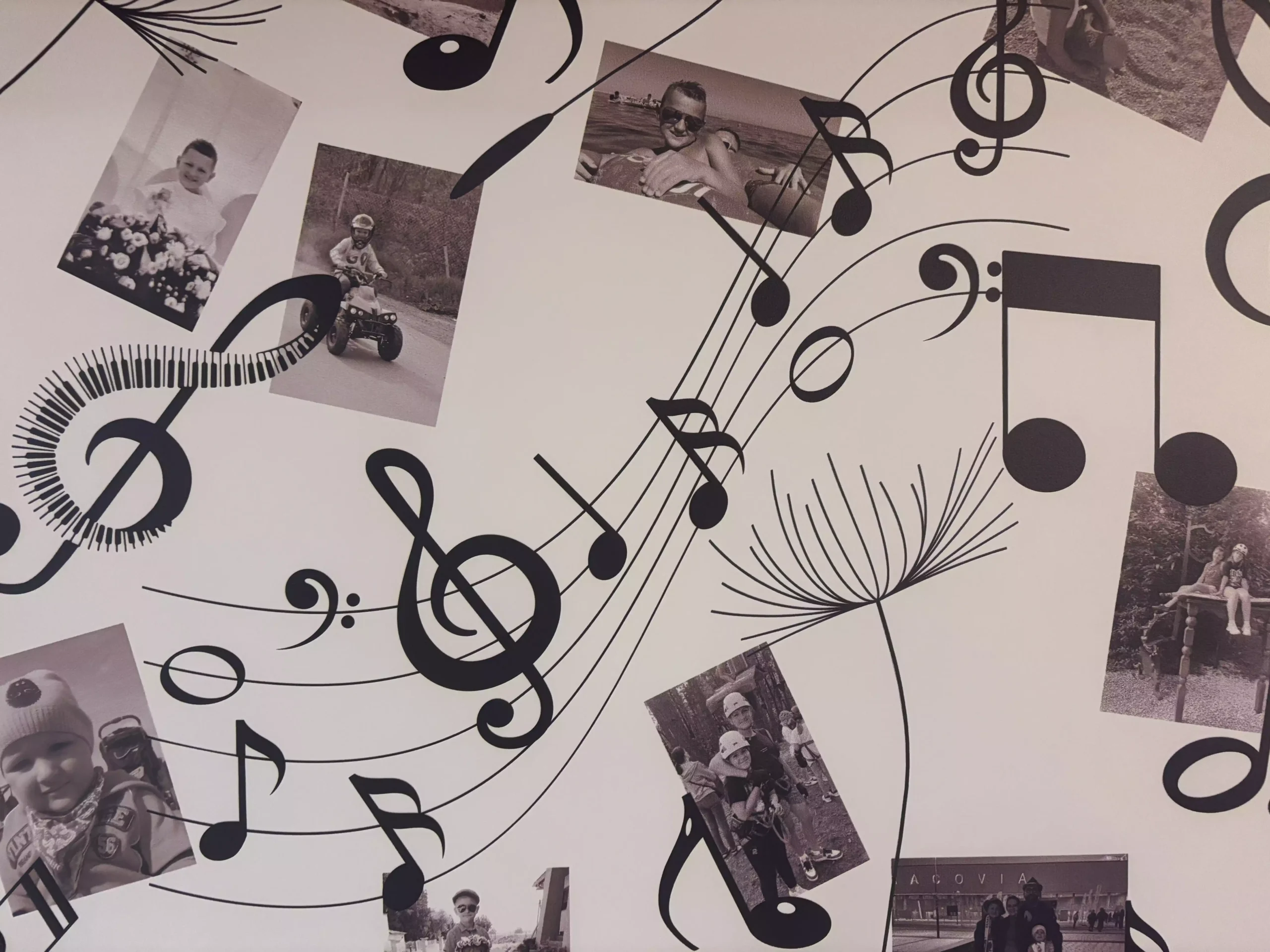 Grafika na ścianie współgra z salonem i pianinem. Stąd też nutki które odlatują z dmuchawca niosąc dziesiątki zdjęć.